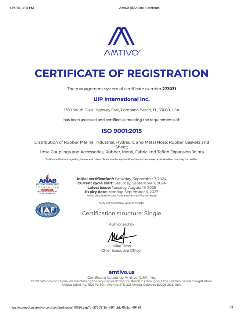 Quality is of utmost importance in critical industrial applications. UIP International, Inc. is ISO 9001:2015 certified, signifying the highest international standards of quality management and the ability to deliver consistent results.